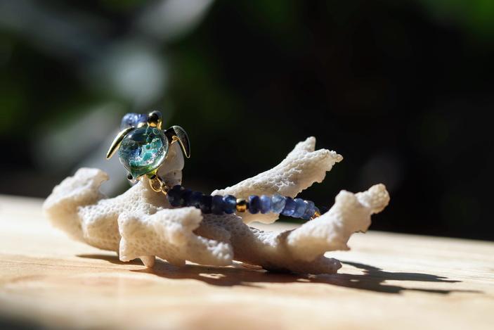 In Hawaiian, Akoni means worthy of praise. Akoni's color spectrum is a sparkling ocean blue, with little islands, or rock outcroppings.